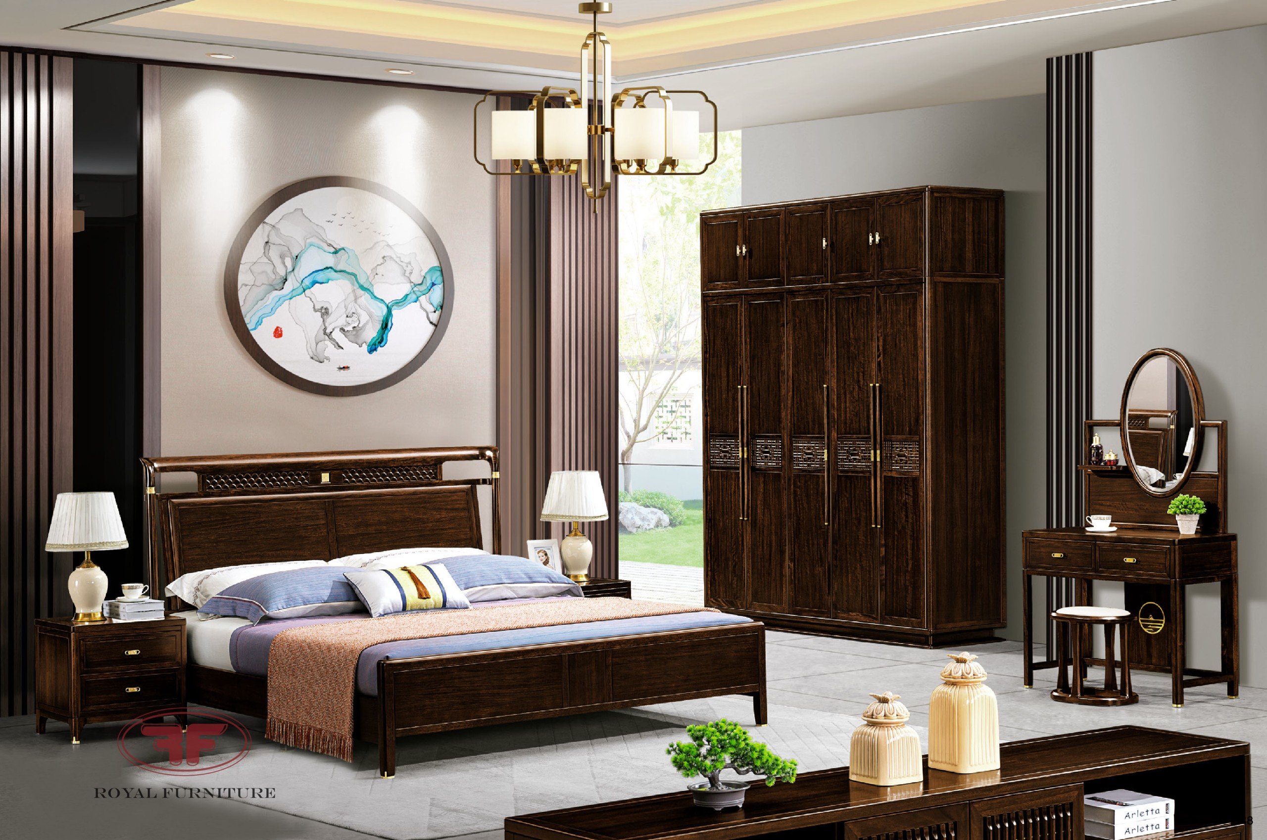 Để phòng ngủ được hài hòa tổng thể thì nên thiết kế và lựa chọn nội thất đồng bộ tone sur tone về màu sắc , chi tiết . Bộ giường ngủ indochine 4 món nhập khẩu gỗ tự nhiên cao cấp 2335 đồng bộ tổng thể về màu sắc , hoa văn chi tiết , combo 4 món gồm : giường 1m8 x2m , táp đầu giường , bàn trang điểm và tủ quần áo . Ngoài ra nếu phòng ngủ rộng , khách hàng có thể mix cùng với kệ tivi phòng ngủ và bộ bàn trà thư giãn .