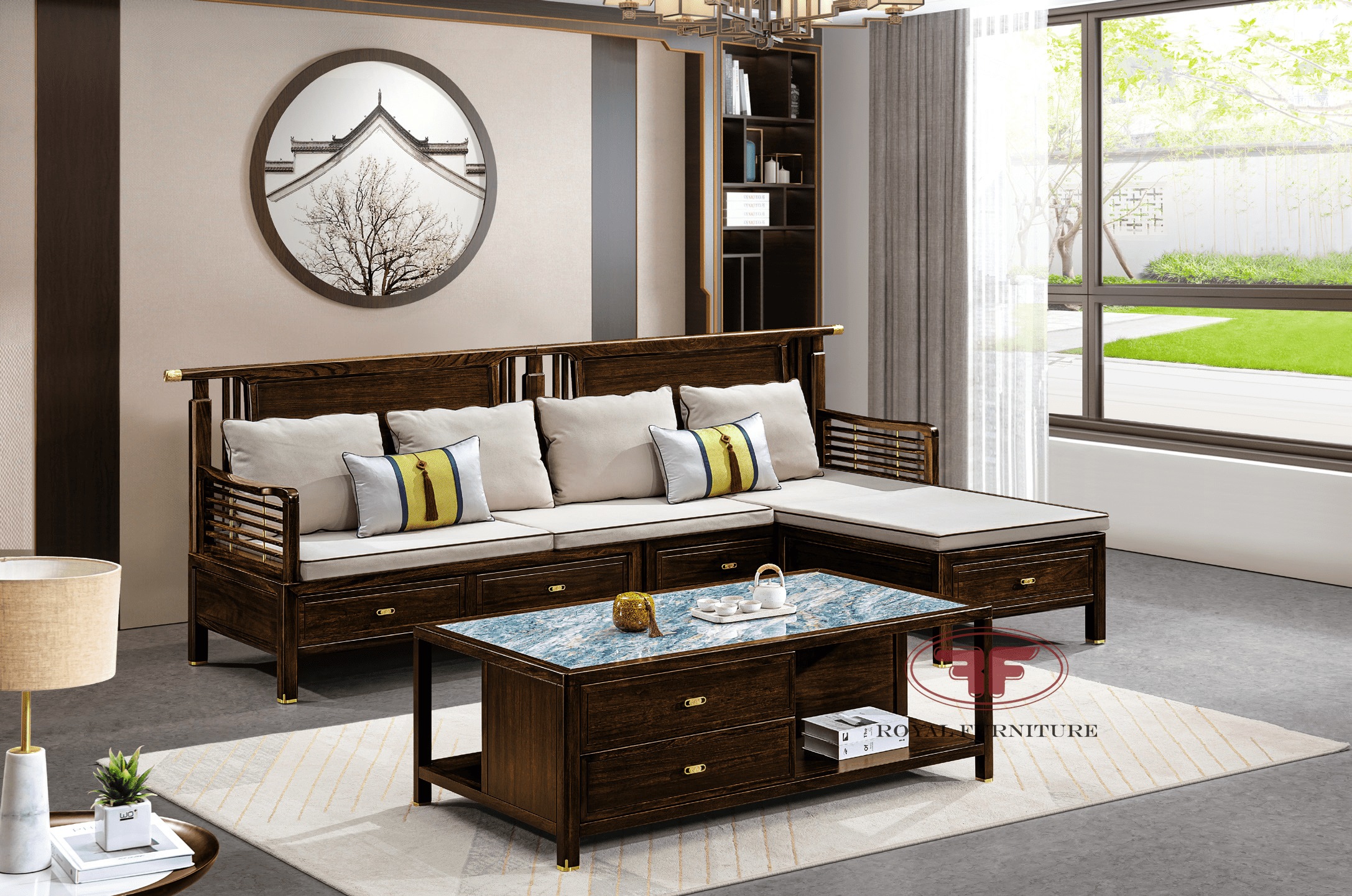 Bộ sofa chữ L phong cách indochine 2307 có thiết kế hiện đại kết hợp với nét truyền thống Á Đông, tạo nên sự sang trọng và tinh tế, đặc trưng của nội thất indochine. Phần tựa lưng được thiết kế trần gỗ với các thanh gỗ song song tạo điểm nhấn và tính thẩm mỹ. Sofa góc indochine 2350 được thiết kế theo hình chữ L, tận dụng tối đa không gian và tạo góc ngồi thoải mái.