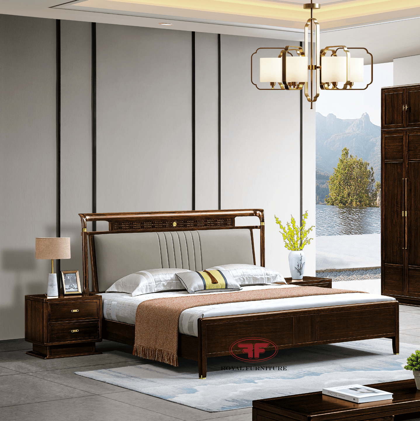 Phần đầu giường của giường ngủ indochine nhập khẩu 2330 được cách điệu bọc da xám cao cấp nổi bật trên nội thất indochine màu dạt hẻ. Chưa hết, phần đầu giường được thiết kế uốn lượn tạo cảm giác mềm mại. Nếu phòng ngủ rông, bạn có thể đặt thêm táp đầu giường sẽ nâng tầm sự sang trọng vượt bậc. Tất cả các mẫu nội thất indochine full phòng khách, phòng ăn, phòng ngủ, phòng làm việc đều có tại Nội thất Tân Hoàng Gia.